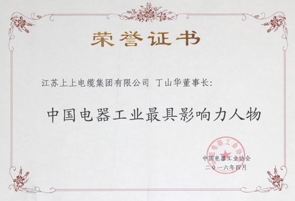 2016年4月8日,中國電器工業協會在浙江湖州組織召開了第五屆理事會第二次會議。會上舉行了“2015年度中國電器工業最具影響力宣傳活動”授牌儀式,江蘇上上電纜集團榮獲“2015年度中國電器工業最具影響力品牌”稱號,集團董事長丁山華入選“2015年度中國電器工業最具影響力人物”。